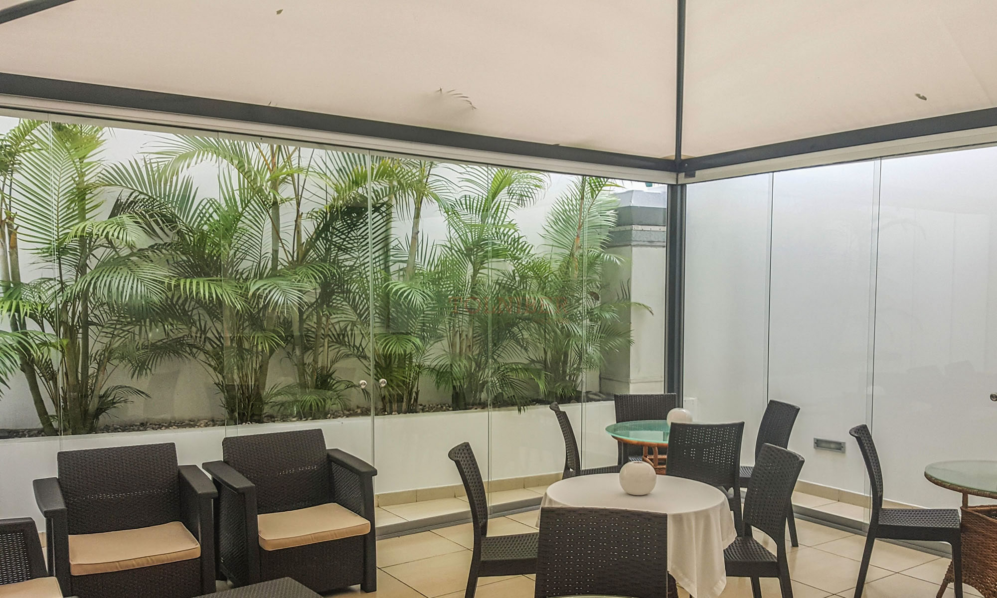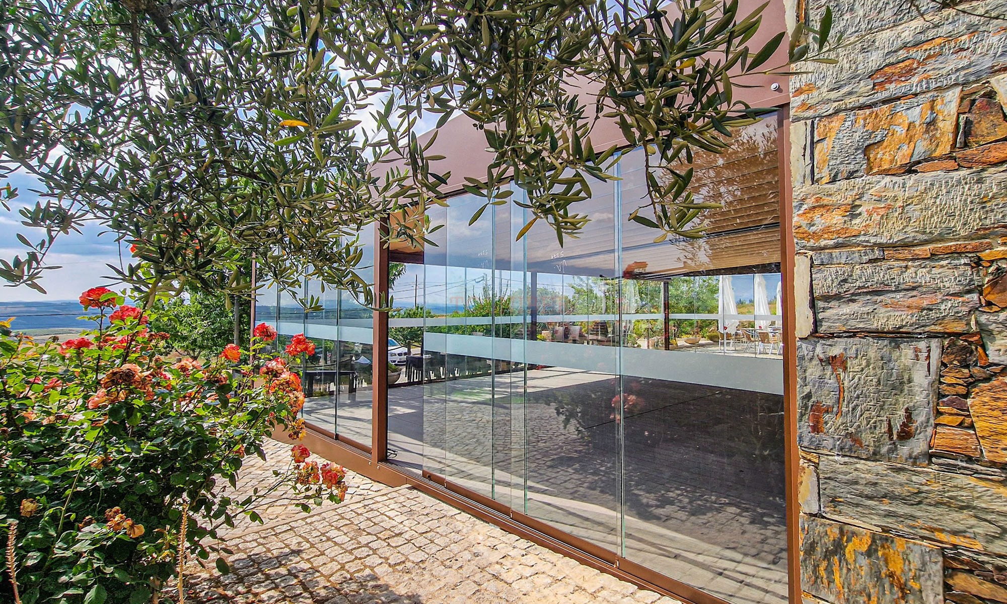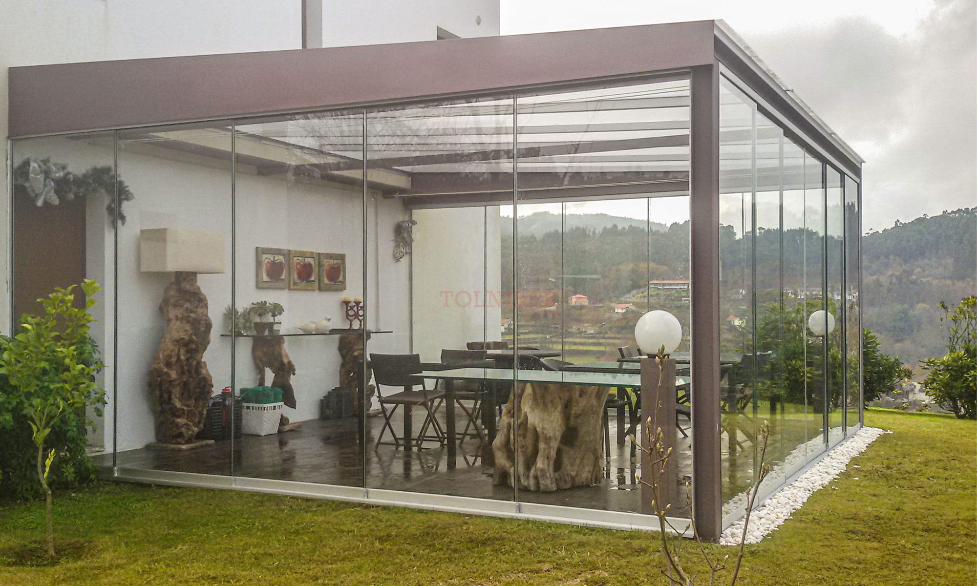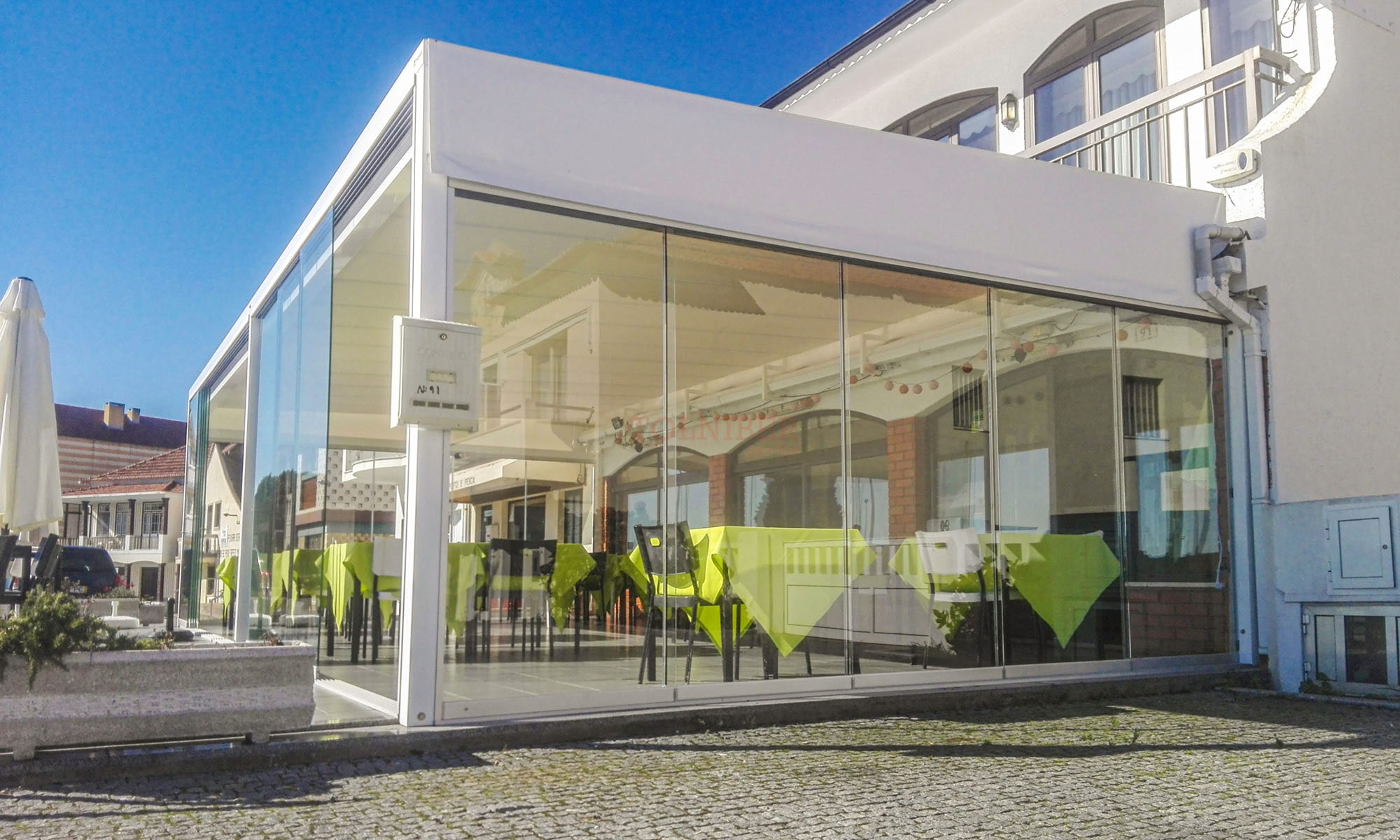 Modelo composto por cortinas de vidro deslizantes, que protegem os espaços contra ventos e chuva. Enquadra-se em esplanadas, pérgulas e alpendres, pois permite a passagem de luz solar e a visibilidade da paisagem envolvente.
