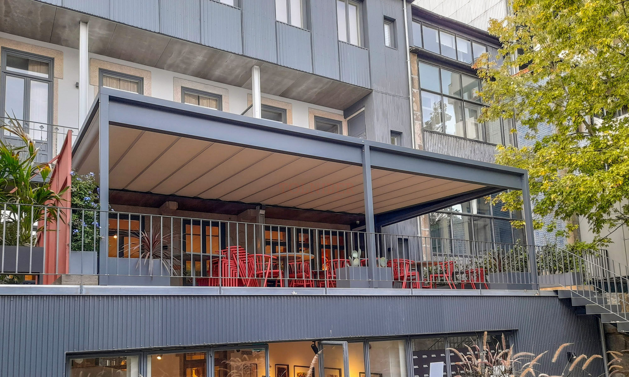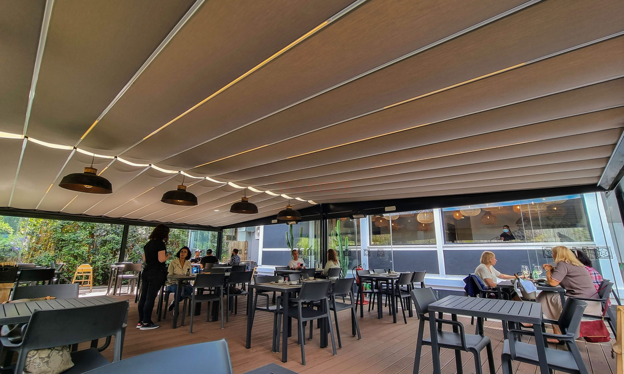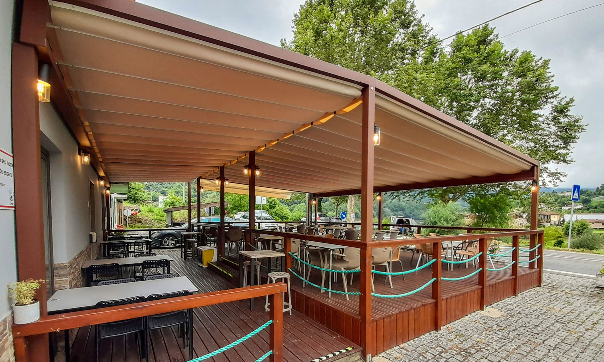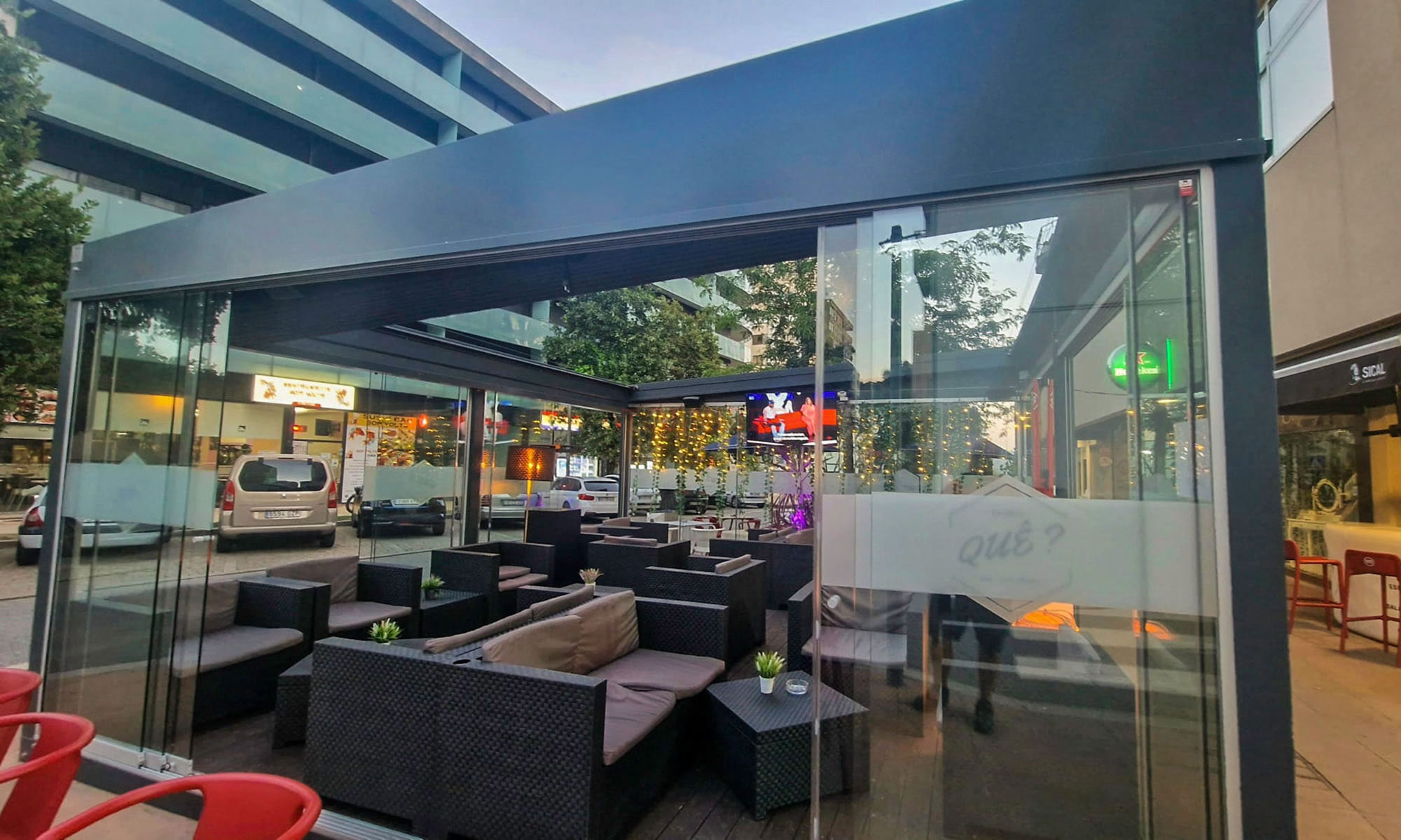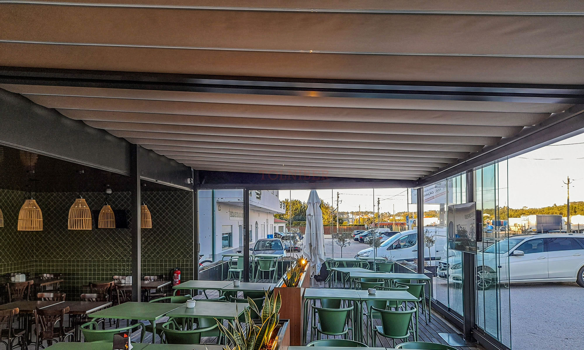 Sistema de pérgula retrátil com inclinação mínima, permite aumentar o seu espaço, criando ambientes protegidos e cómodos. com pouca inclinação permite alongar-se no espaço, facultando área livre para uso no seu estabelicimento ou uso pessoal.