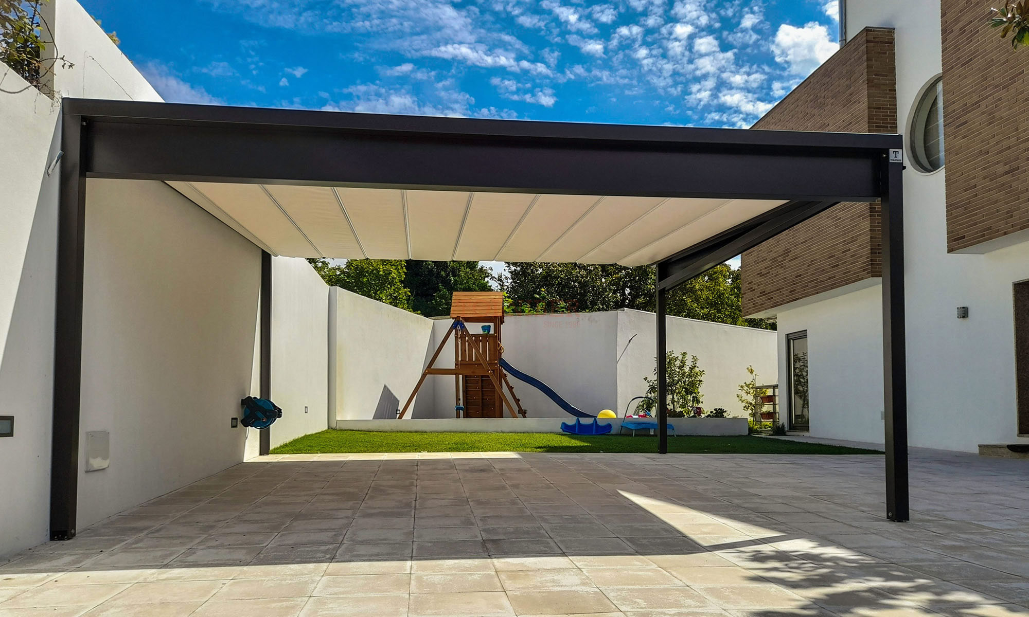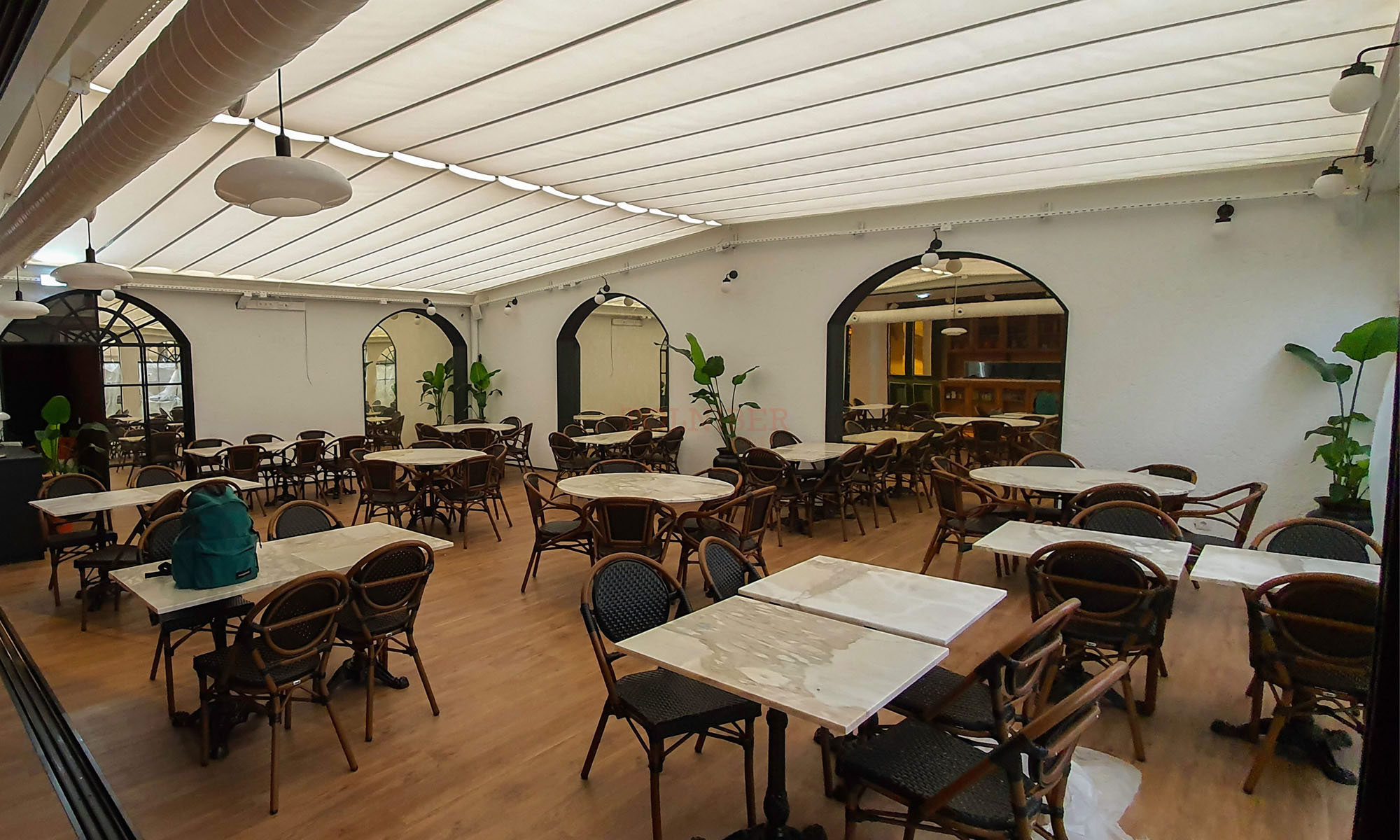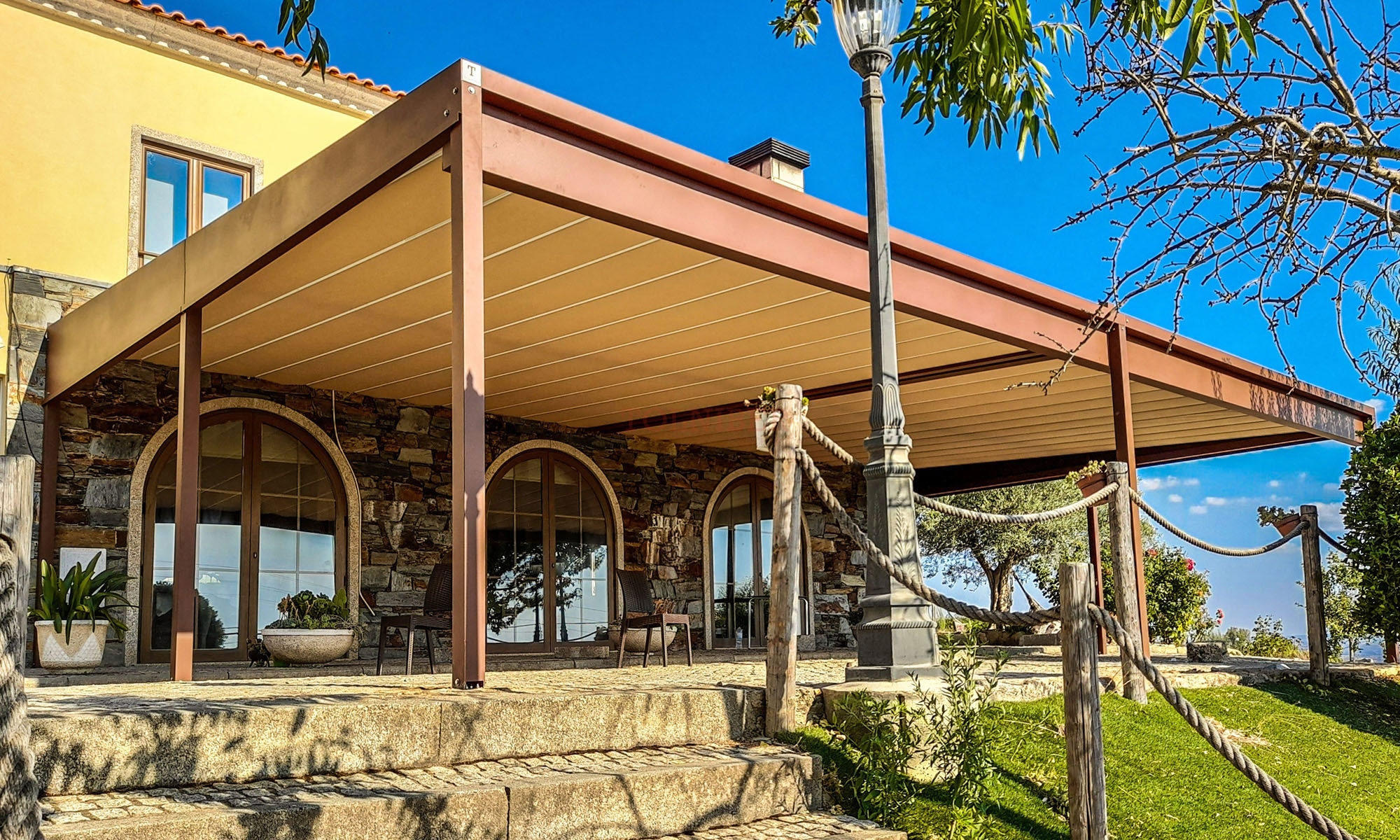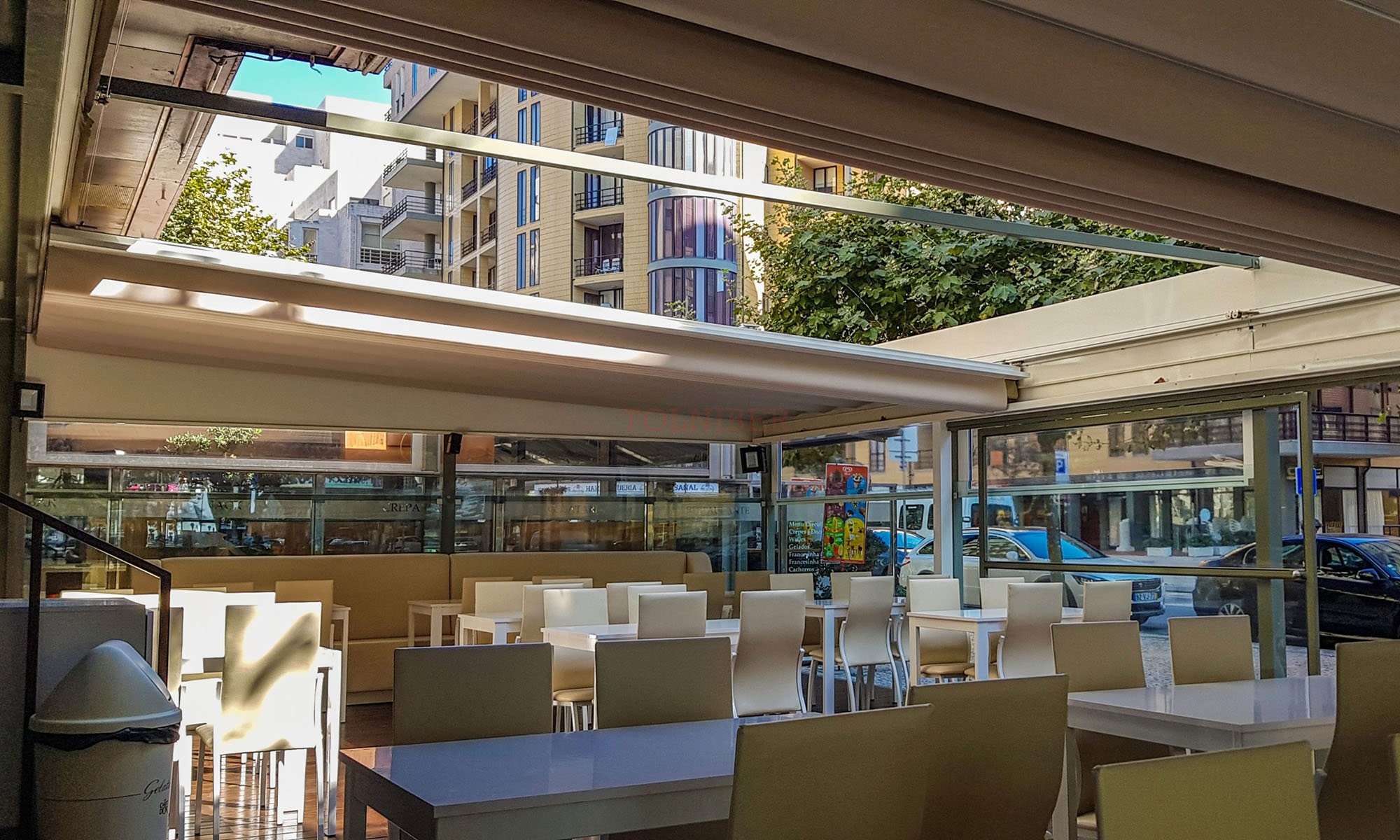 Sistema de pérgula retrátil com inclinação mínima, permite aumentar o seu espaço, criando ambientes protegidos e cómodos. com pouca inclinação permite alongar-se no espaço, facultando área livre para uso no seu estabelicimento ou uso pessoal.