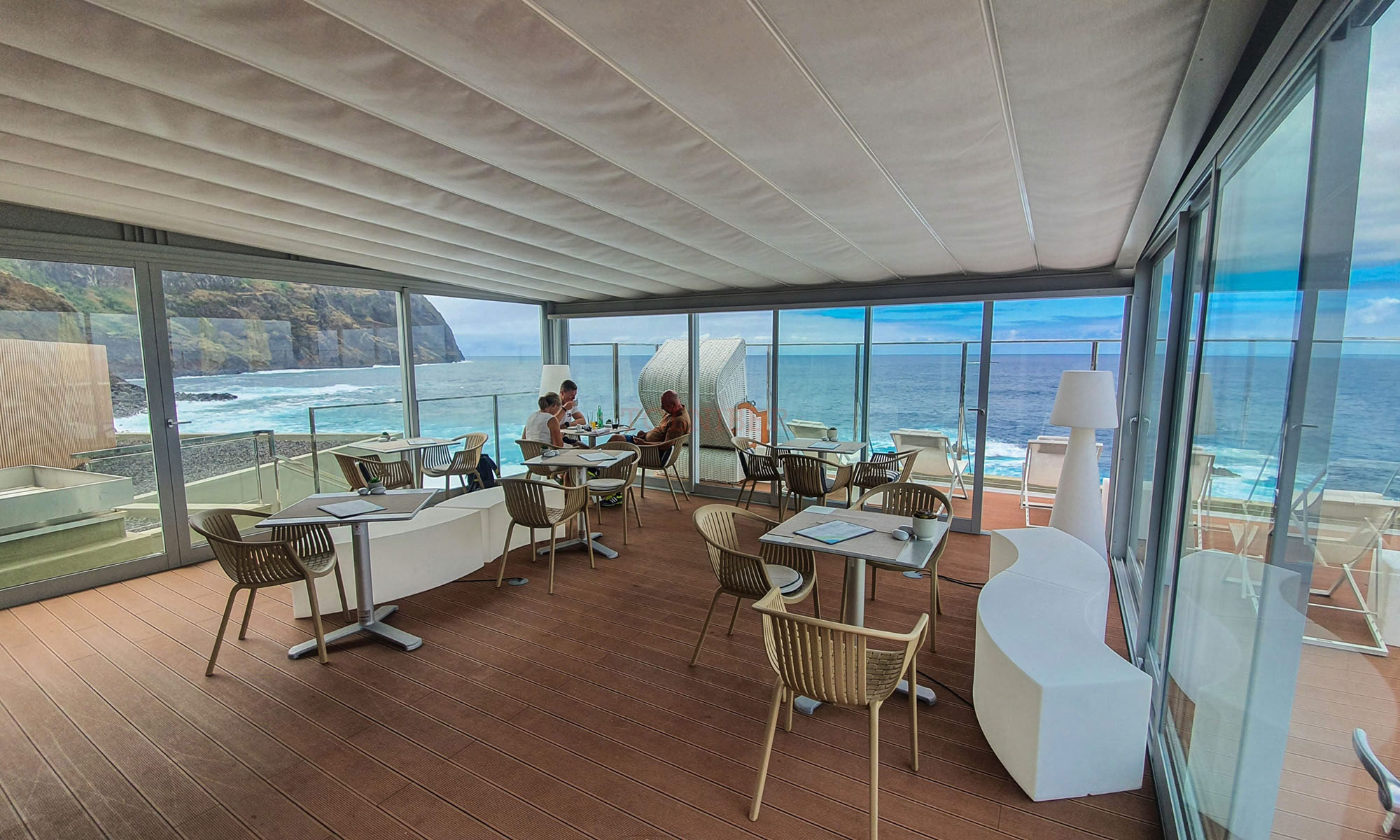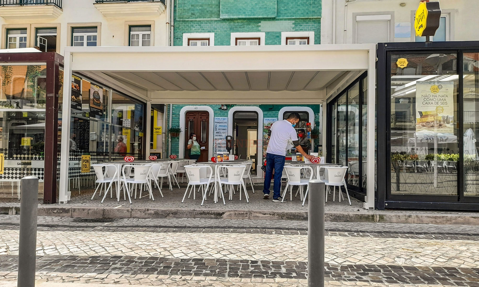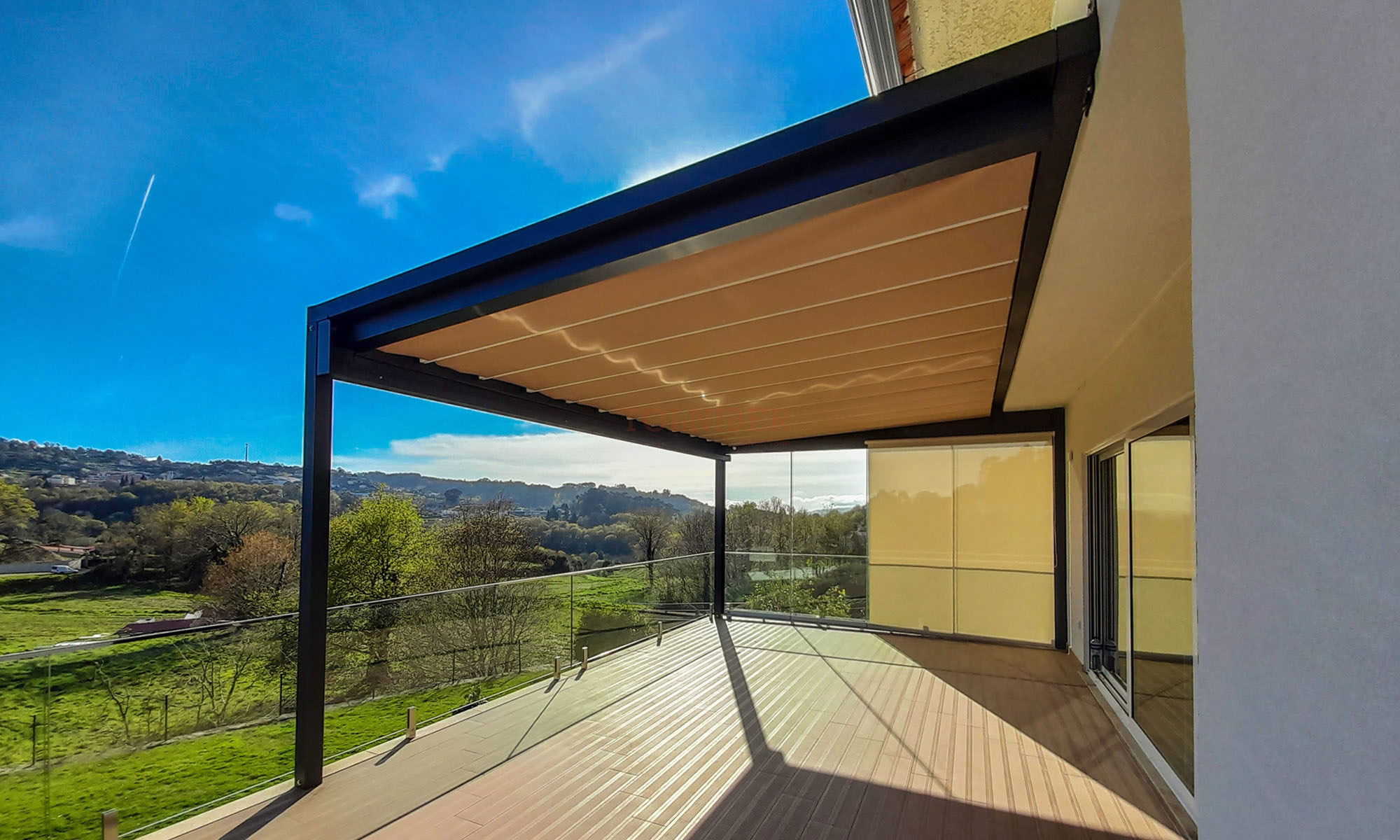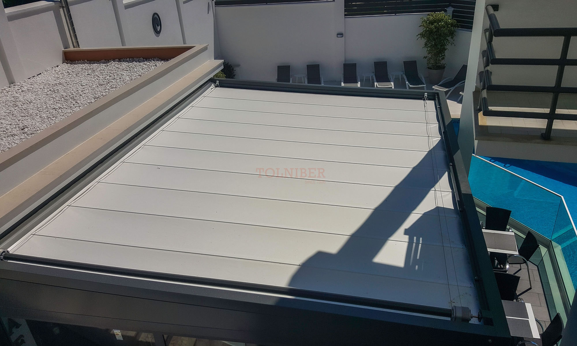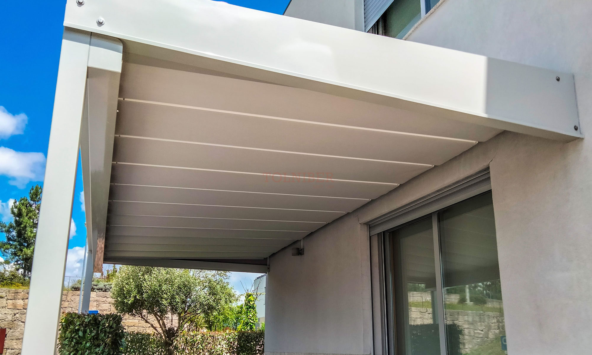 Sistema de pérgula retrátil com inclinação mínima, permite aumentar o seu espaço, criando ambientes protegidos e cómodos. com pouca inclinação permite alongar-se no espaço, facultando área livre para uso no seu estabelicimento ou uso pessoal.